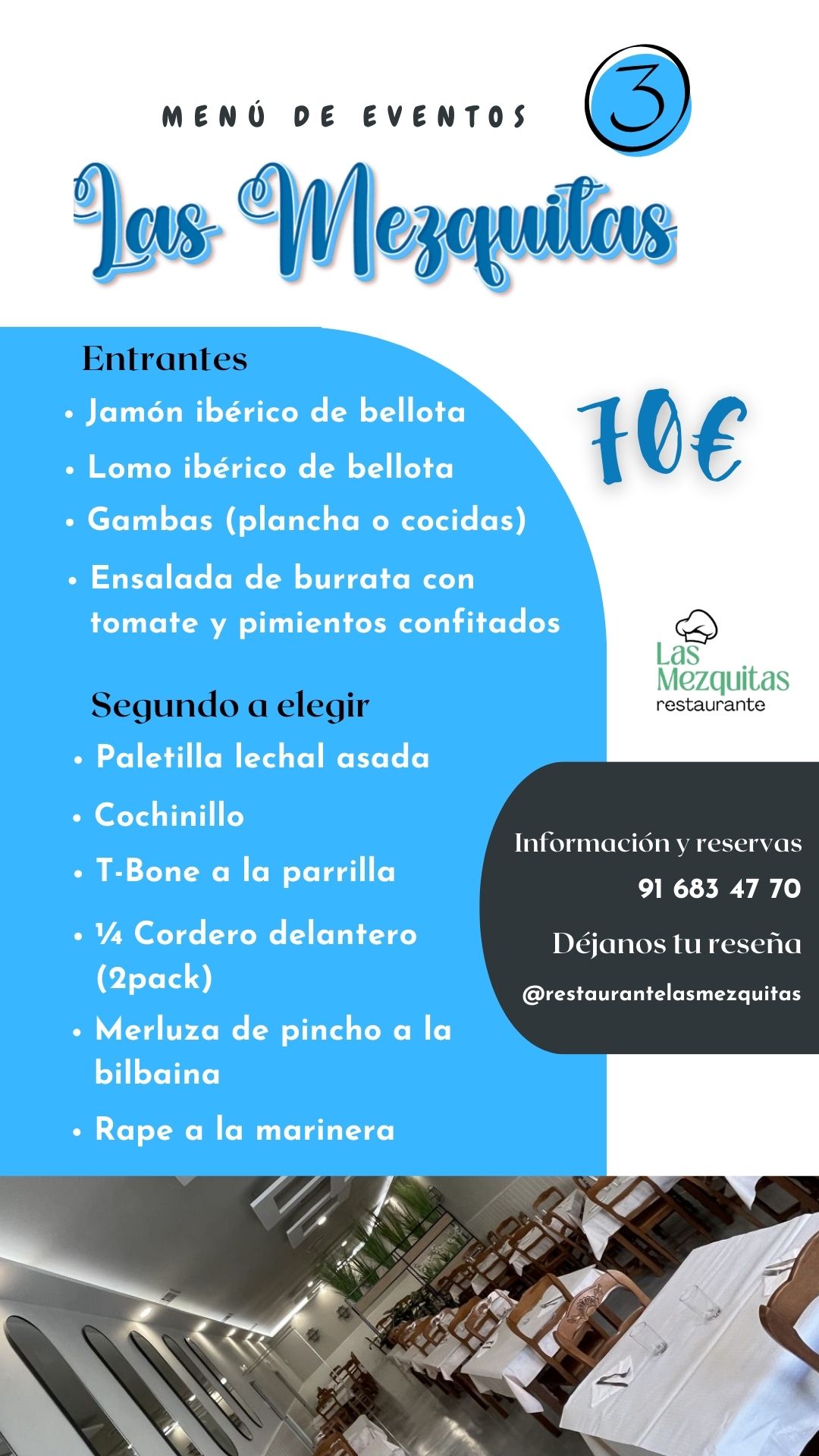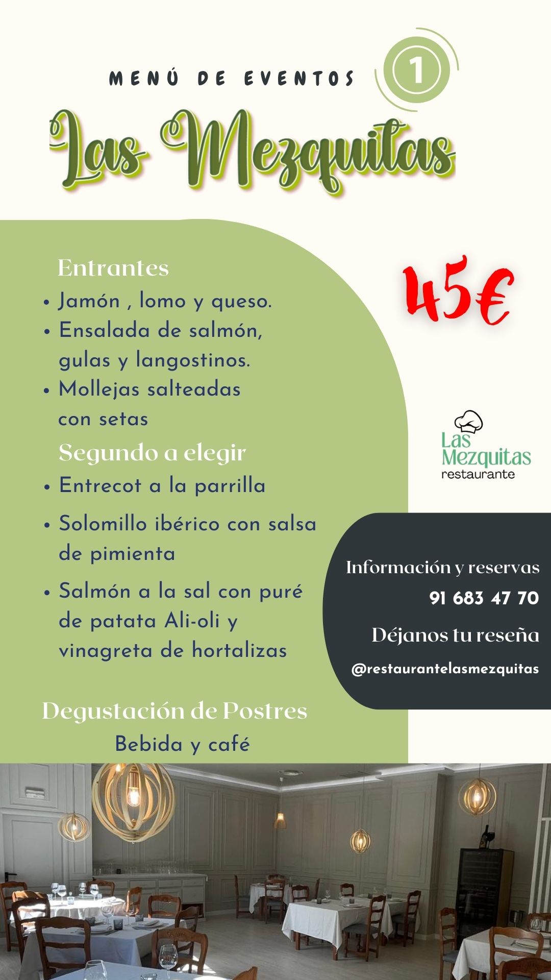 Contamos con 2 amplios y versátiles espacios: el salón de menú, donde servimos de lunes a viernes nuestro menú del día y el salón de carta, donde servimos las especialidades de nuestra cocina y el menú ejecutivo.